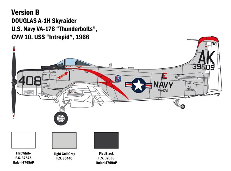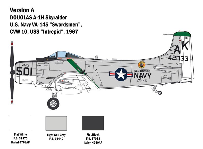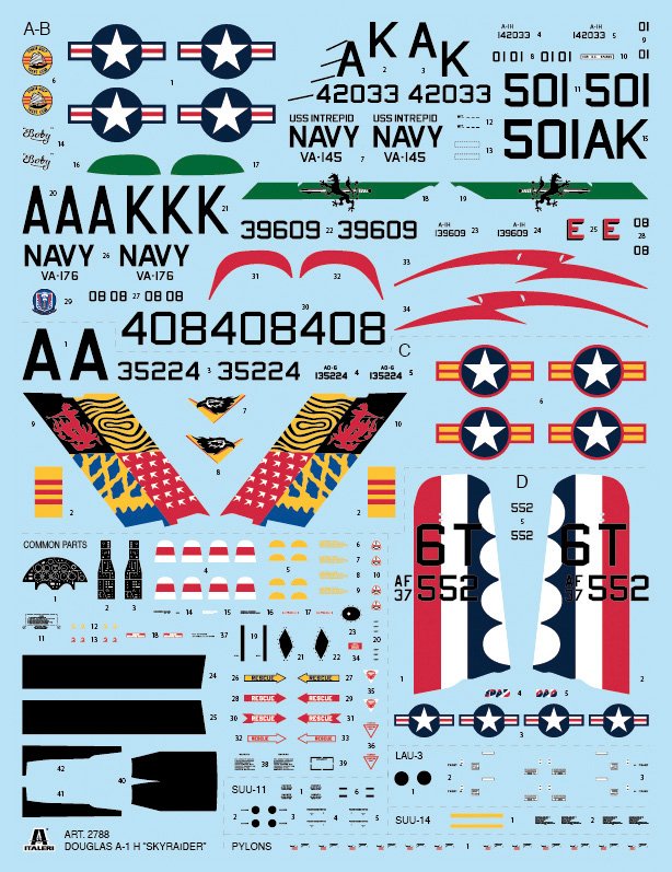 SUPER DECALQUES PARA 4 VERSÕES – INSTRUÇÕES DE CORES O Douglas Skyraider foi construído imediatamente após a Segunda Guerra Mundial. Apesar do seu tradicional motor a pistão, nascido quando os primeiros jatos já estavam se difundindo, o Skyraider teve uma longevidade operacional extraordinária.
