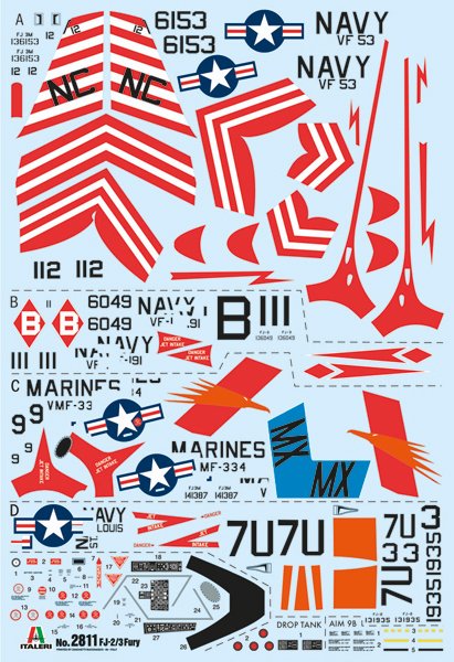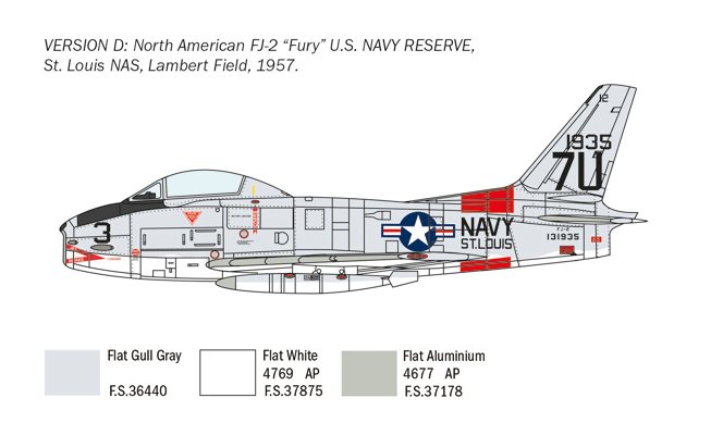 SUPER DECALQUES PARA 4 VERSÕES – INSTRUÇÕES DE CORES FIGURA NÃO INCLUÍDA O norte-americano FJ-2 Fury foi o resultado do pedido da Marinha dos Estados Unidos e do Corpo de Fuzileiros Navais dos Estados Unidos para uma versão baseada em porta-aviões do caça de asa varrida F-86 Sabre.