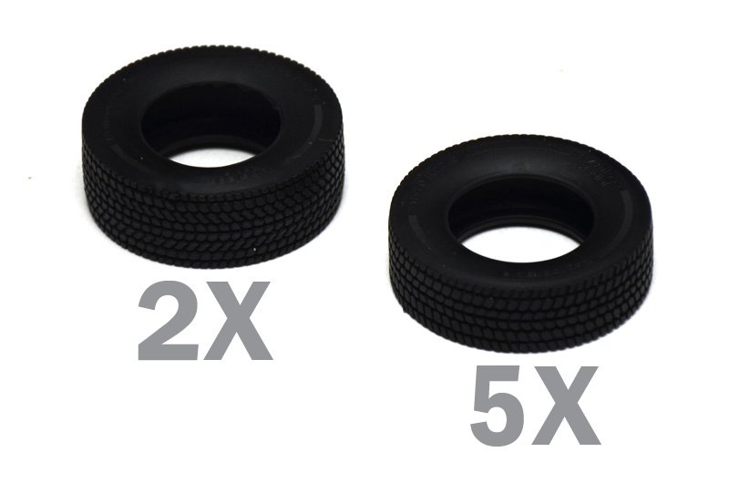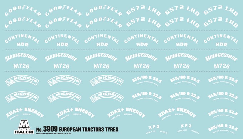 MOLDES 100% NOVOS – DECALQUES INCLUÍDOS Acessórios utilizáveis apenas em tratores europeus O PACOTE CONTÉM 7 JANTES + 7 PNEUS: 2 pneus dianteiros e jantes tamanho 385/65 R22.5 – 5 pneus traseiros e jantes tamanho 315/80 R22. 5