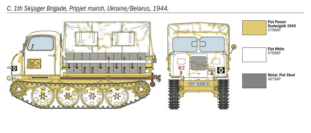 CONTÉM 7 FIGURAS, ACESSÓRIOS E ESTEIRA DE INVERNO – LONA SUPERIOR NÃO INCLUÍDA Para lidar com as difíceis condições das estradas na Frente Oriental, os alemães construíram tratores de esteira