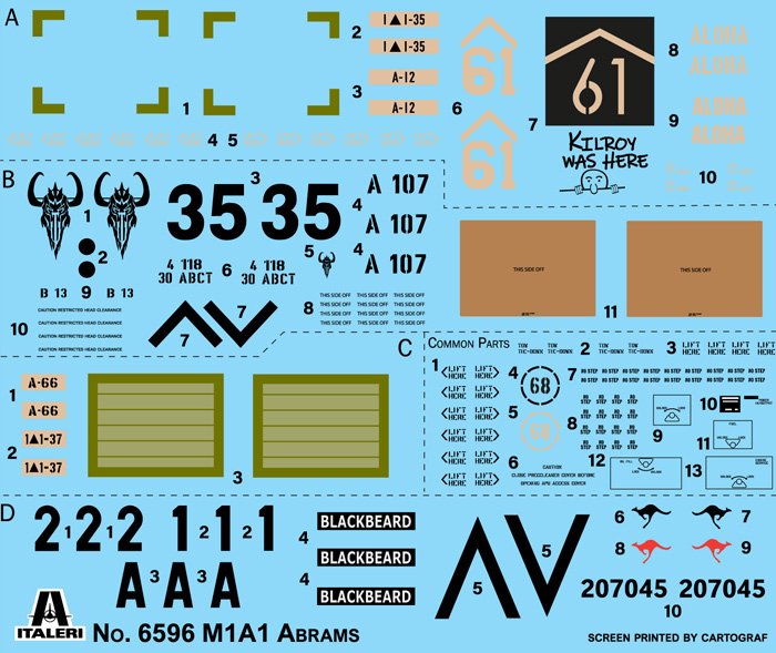 DECALQUES PARA 4 VERSÕES – NOVAS PISTAS COLÁVEIS OU ALTERNATIVAMENTE LIGAÇÃO E COMPRIMENTO – FOLHA DE INSTRUÇÕES DE CORES O tanque M1 Abrams de terceira geração constitui a espinha dorsal das